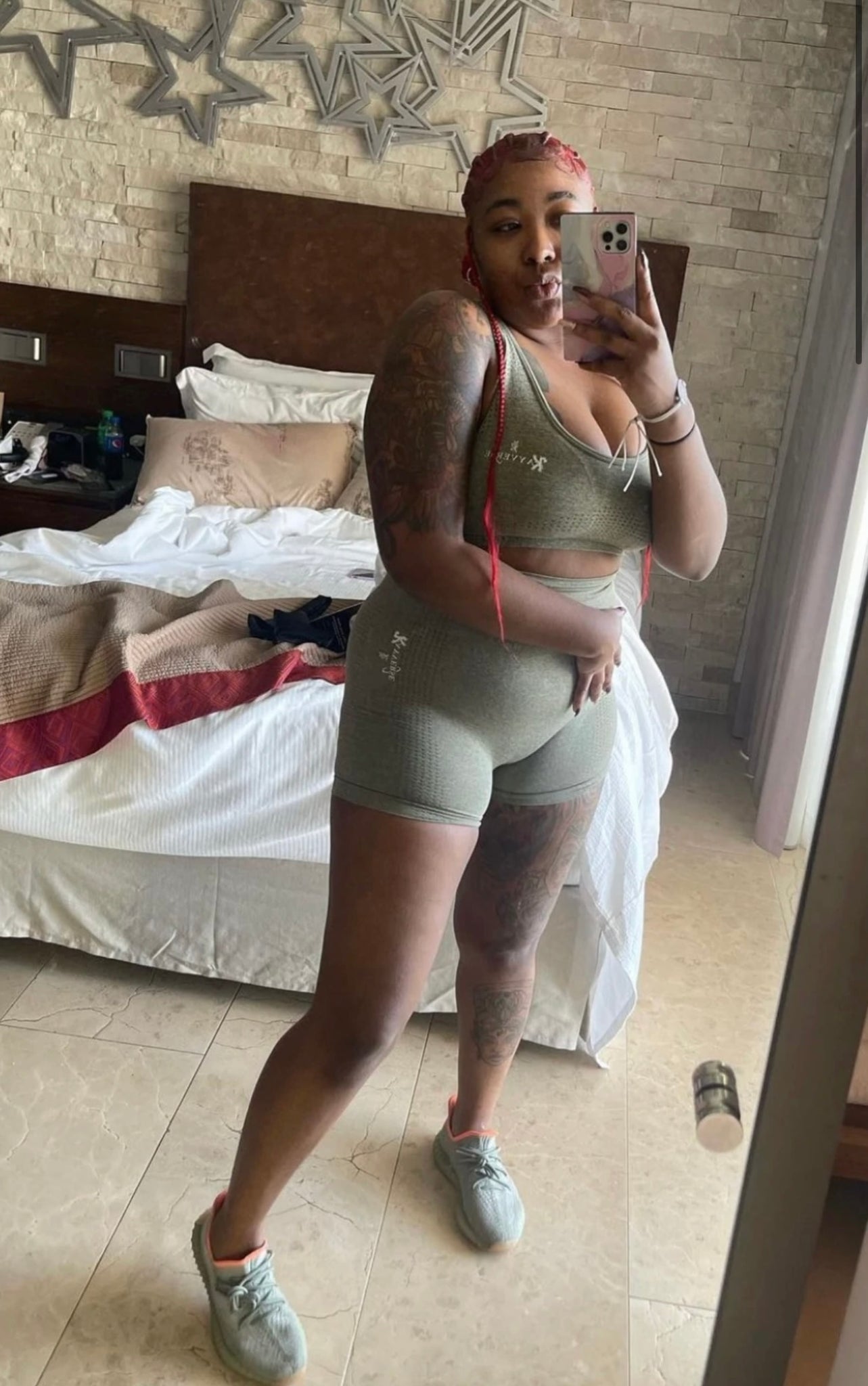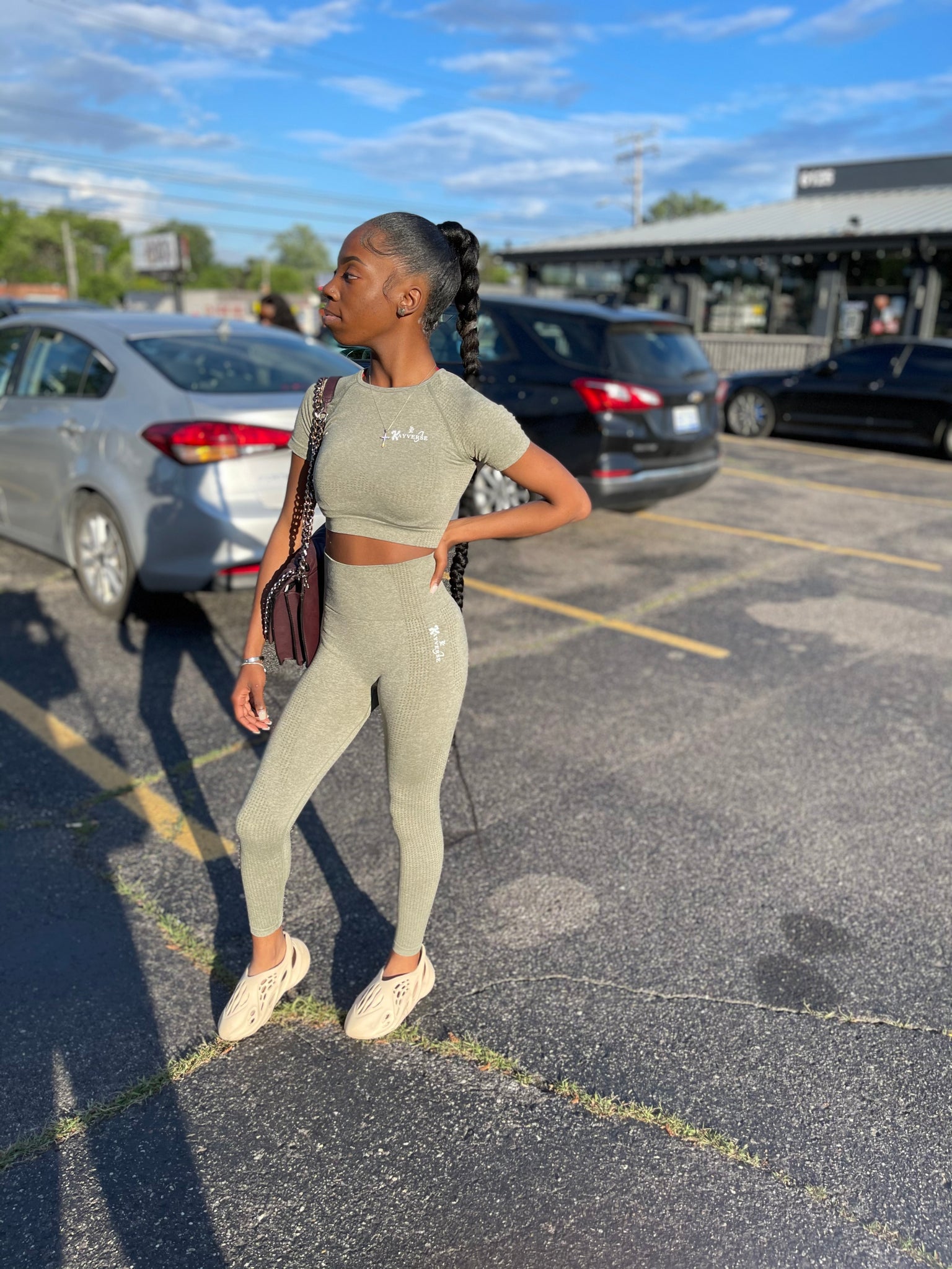 This is the olive green active set with the full shirt and the pants. And also the sports bra with the shorts! This set is not very stretchy, so I wouldn’t suggest for you to size down. If you have a heavier bottom get a size large. You won’t be able to jiggle into this set. Model wearing a size small with the full shirt and pants, other two models are wearing a size large!