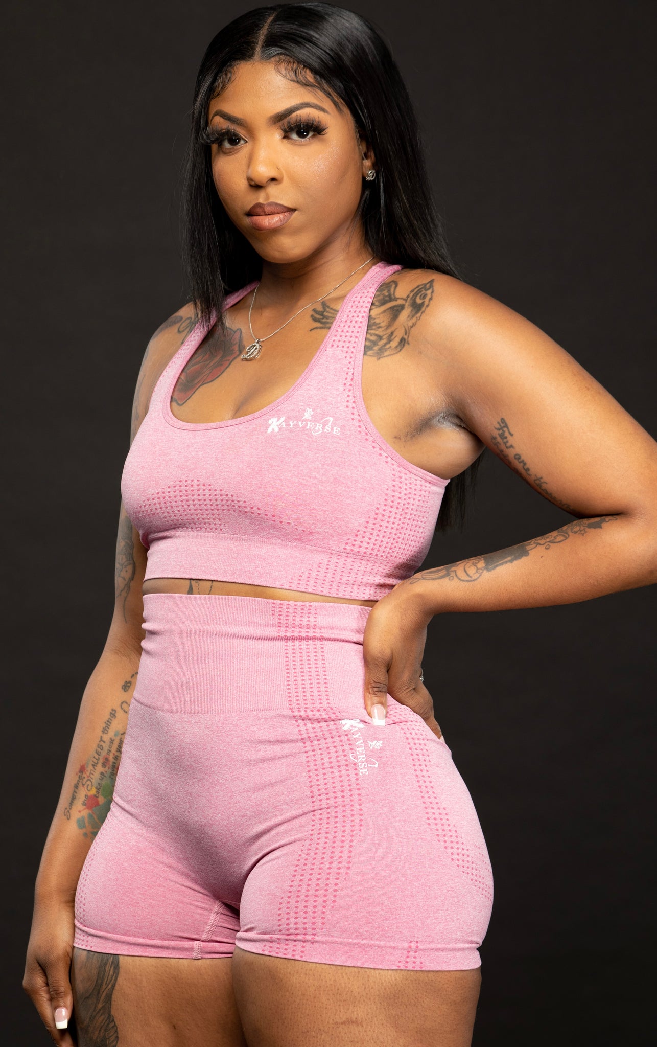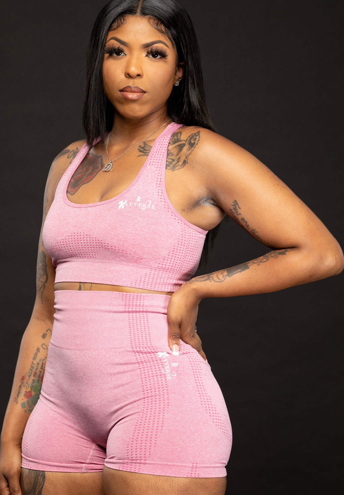 This is the pink active set with the sports bra and the shorts. This set is not very stretchy, so I wouldn’t suggest for you to size down. If you have a heavier bottom get a size large. You won’t be able to jiggle into this set. Model wearing a size medium